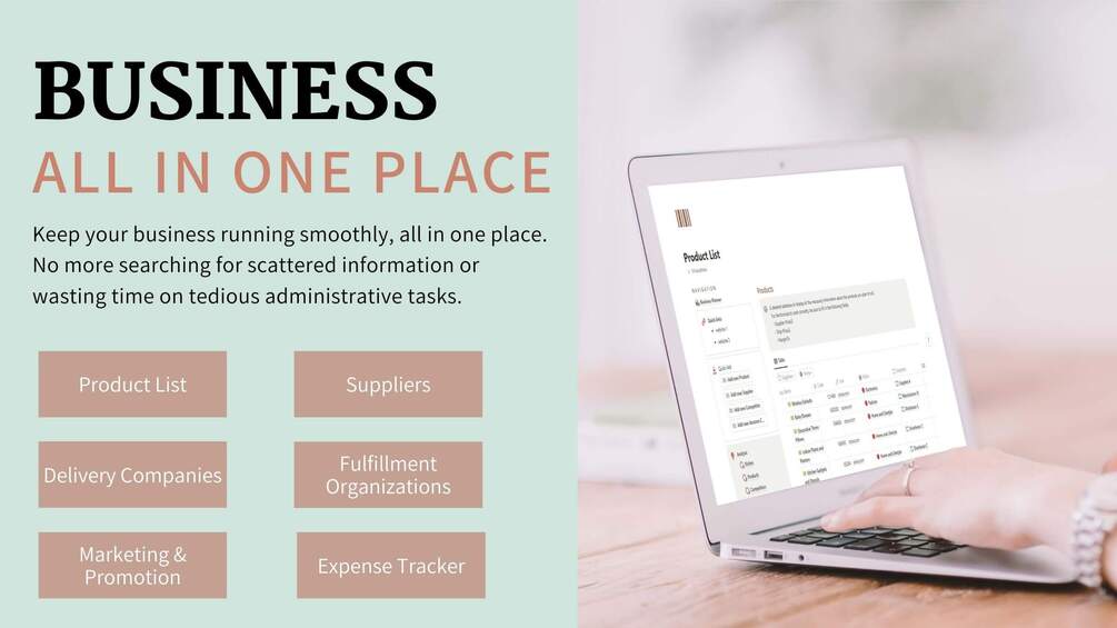 - Business Blocks: Product List, Suppliers, Delivery Companies, Fulfillment Organizations, Marketing and Promotion, Expense Tracker