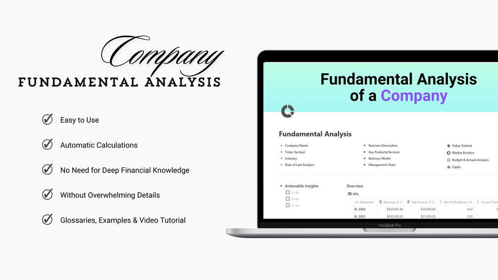 Analyze a company with the Notion Fundamental Analysis Template. It's easy to use and helps you dive into key financial details such as financial statements, ratios, and market position.