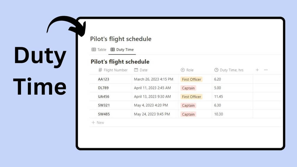 - Duty TimeFlight time and duty time for each flight, as well as the type of duty performed (captain or first officer).