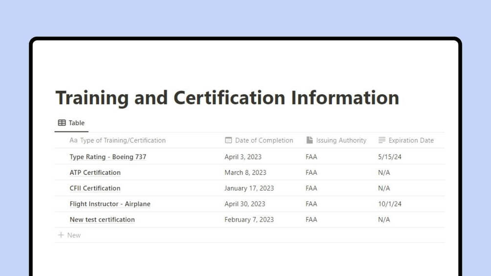 - Training and Certification InformationTracks the pilot's training and certification information, including the type of training or certification, date of completion, issuing authority, and expiration date (if applicable). This information is useful for the pilot to keep track of their qualifications and to ensure that they meet the requirements for certain certifications or job positions.
